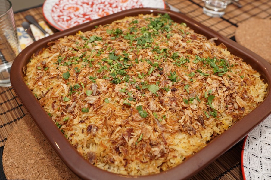 - Assembly: In a large serving bowl/container, place some meat and a couple of ladles of the curry. Place rice layer next. Meat and curry again. Rice again. Repeat until all meat, curry and rice is in your container. Top off dish with scattering of fried shallots on top.
